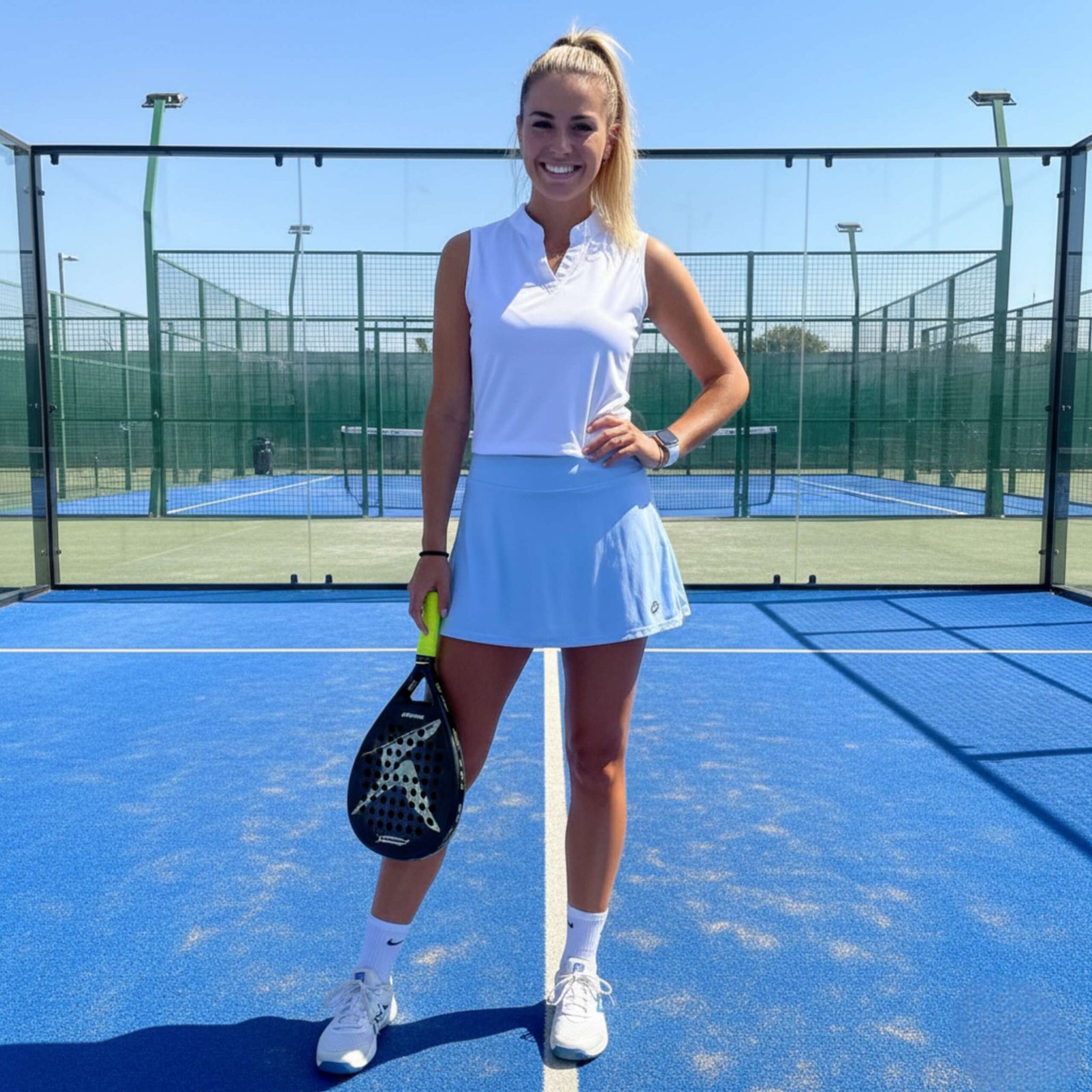 Sport Ladies Set – Crop Top Baby Blue Sleeveless With Collar V Neck – Skirt Baby Blue With Piled Up Waist Style & Left Side Pocket In Front.