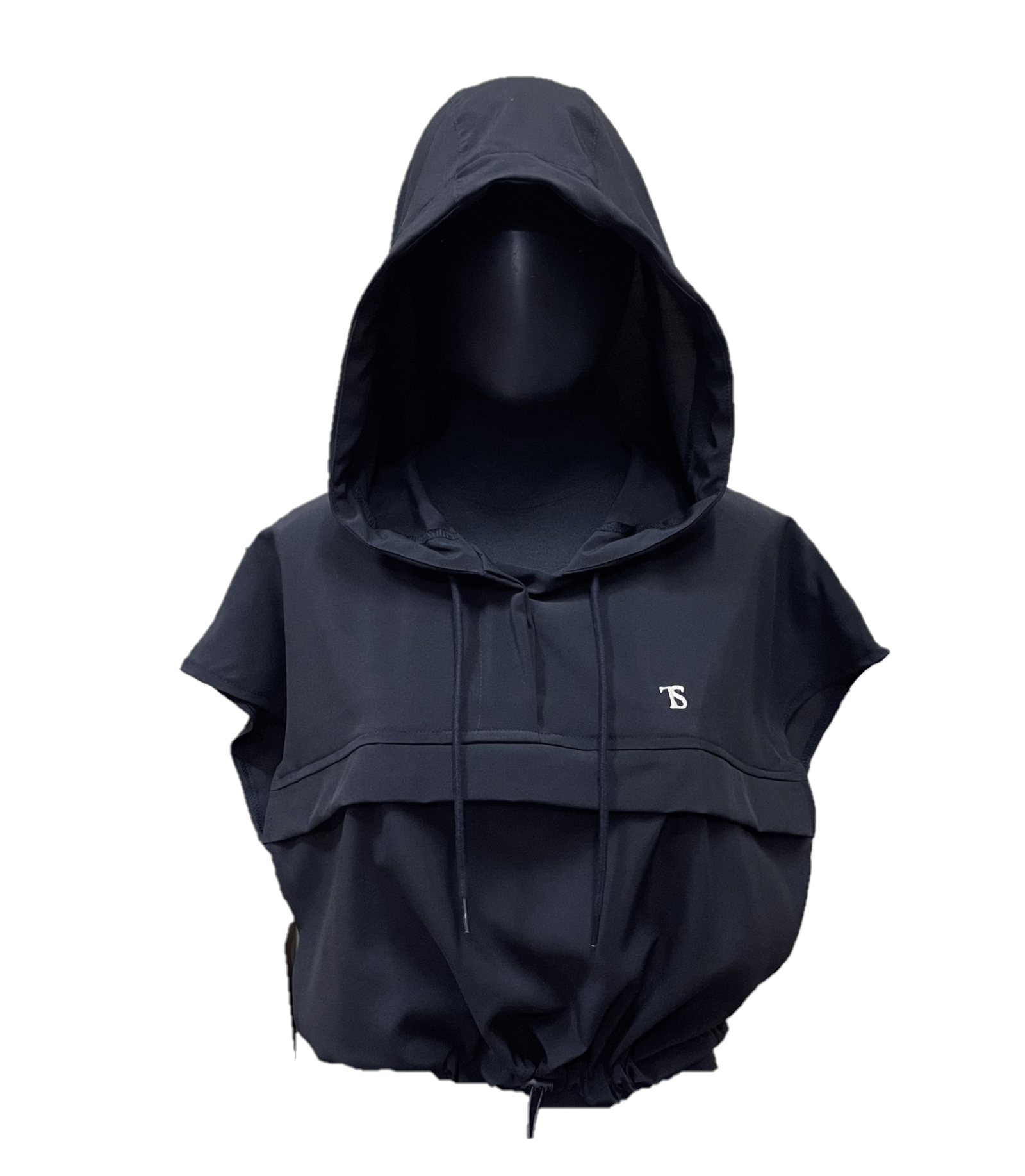 Sport Ladies Jacket Black Pullover Crop With Hood Sleeveless And 2 Front Buttons With One Slanted Zip Fastened Front Pocket and Elastic Sleeve & Waist Ban.