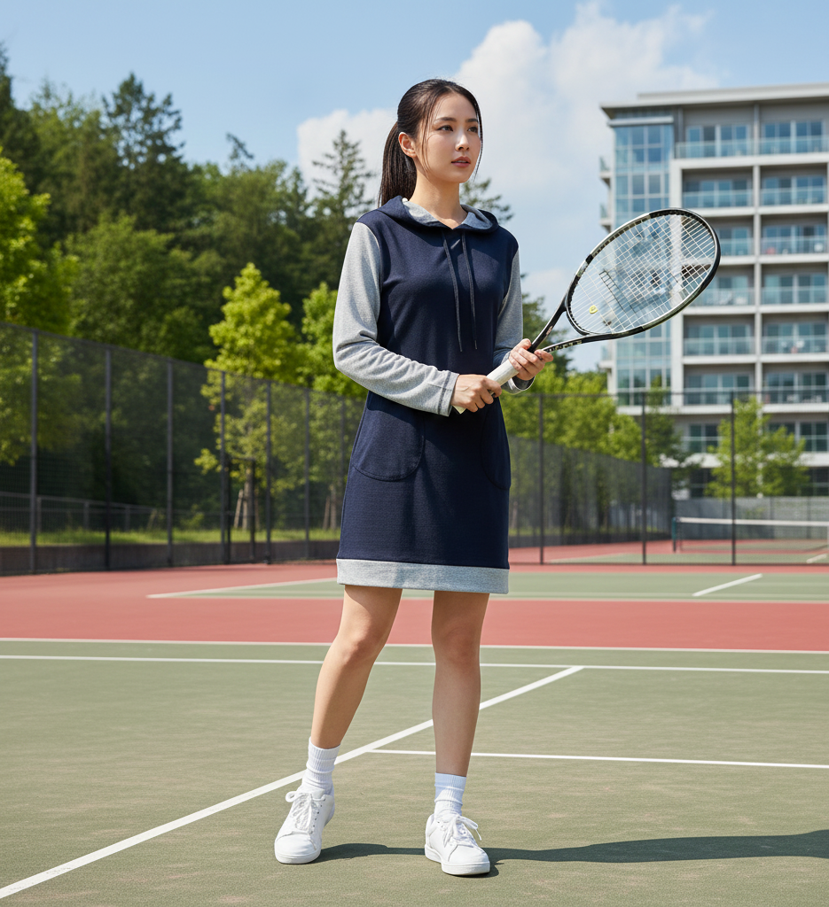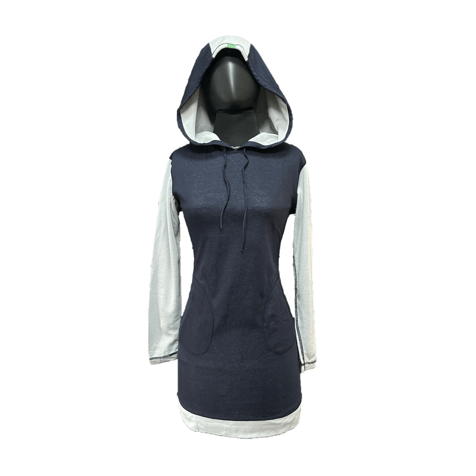 Long-sleeved dress with a sporty design navy two tone color with a light gray combination on the sleeves and bottom, with a hoodie & drawstring and front pockets.
