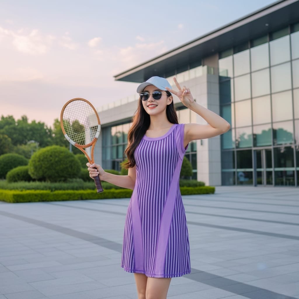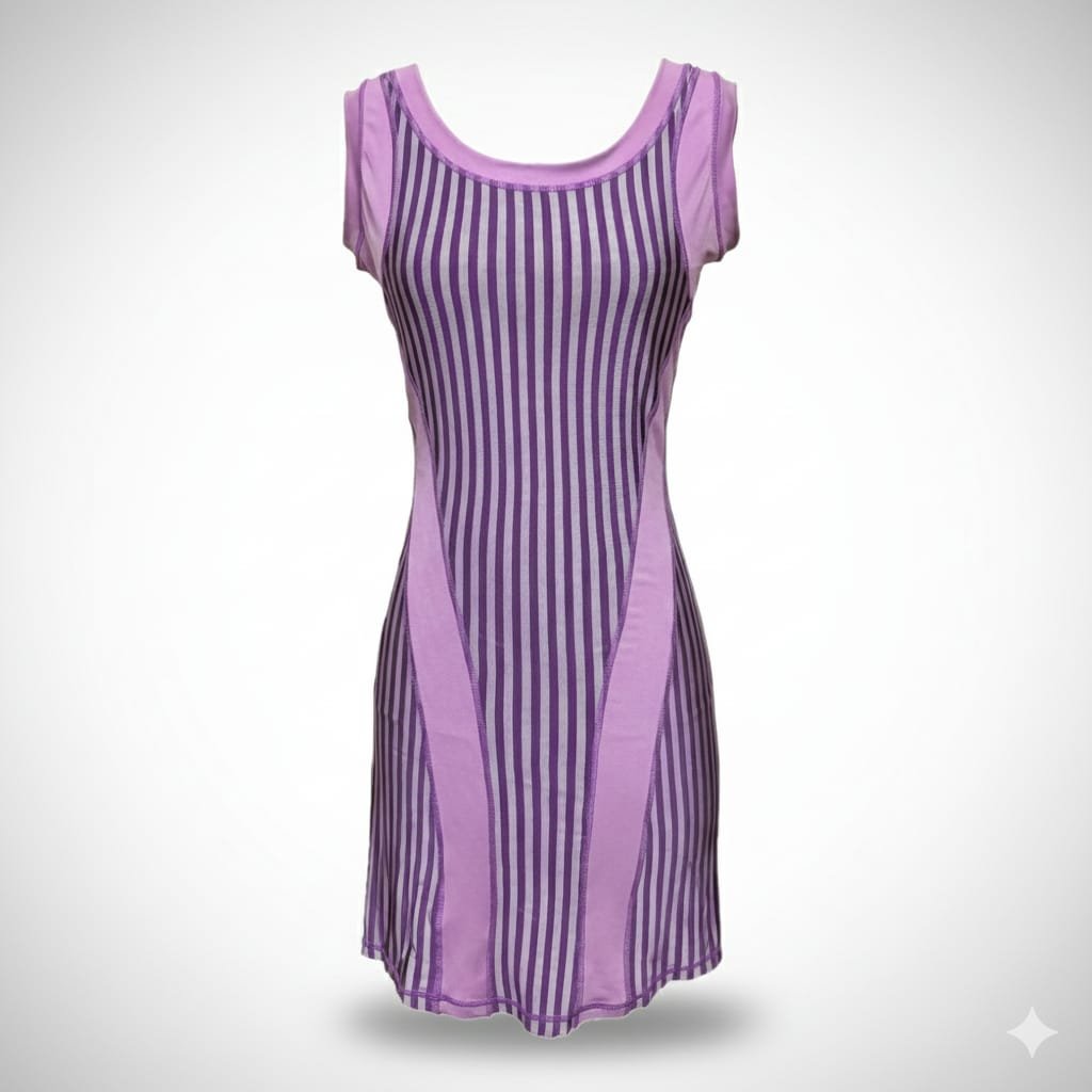 Sport Dress Sleeveless Purple, Mid Purple Lines Motif With Mid Purple Trim On The Neck, Sleeve & A Long The Side.
