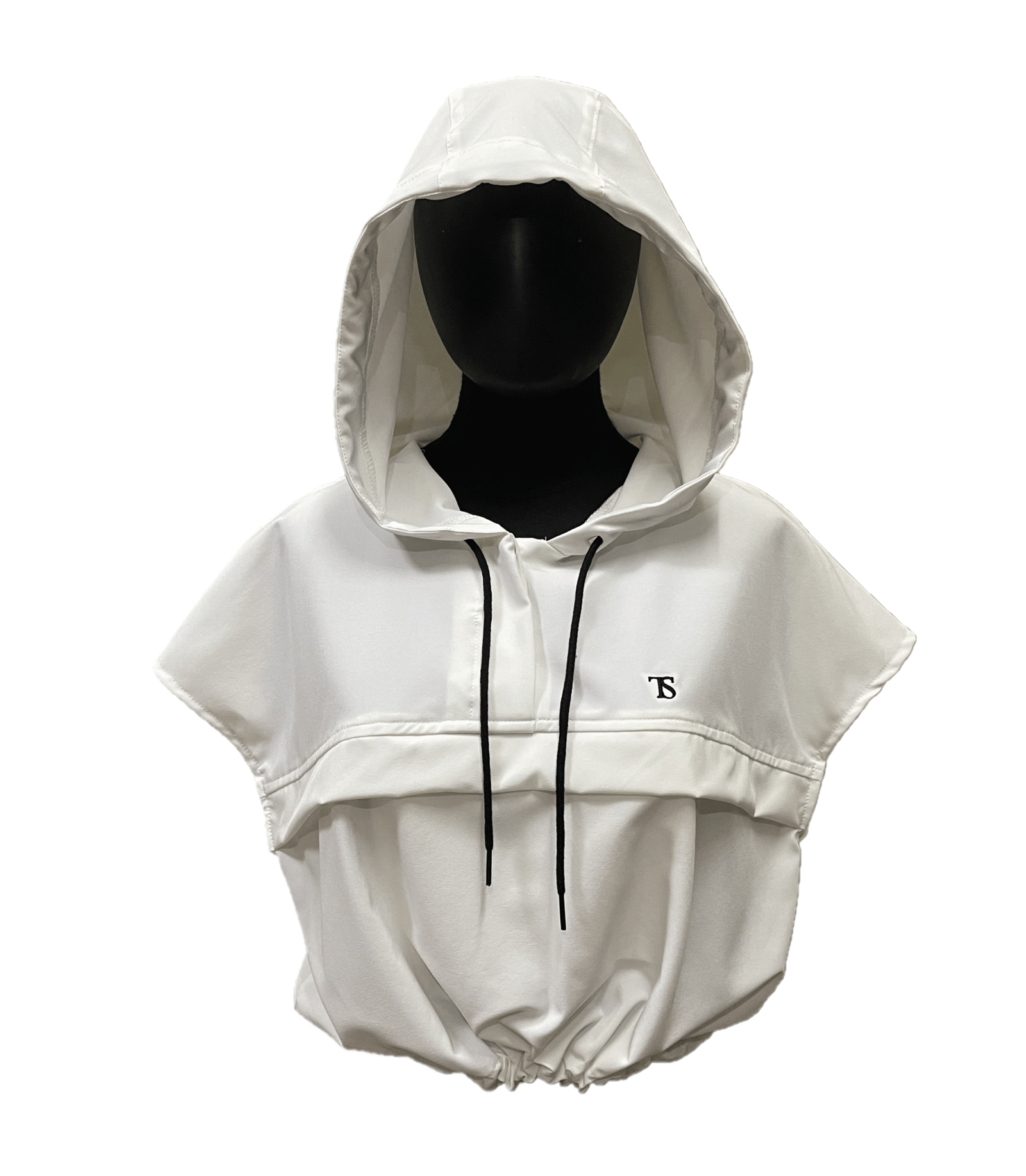 Sport Ladies Jacket White Pullover Crop With Hood Sleeveless And 2 Front Buttons With One Slanted Zip Fastened Front Pocket and Elastic Sleeve & Waist Ban.