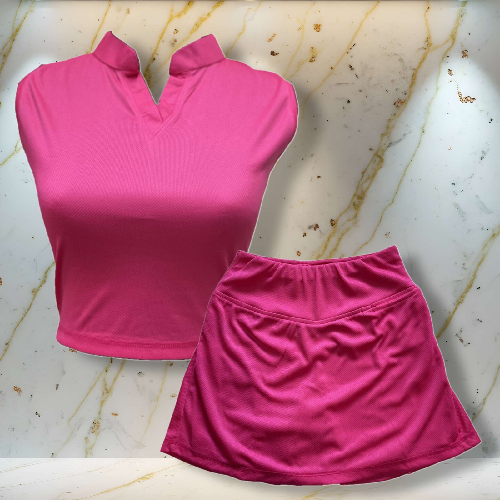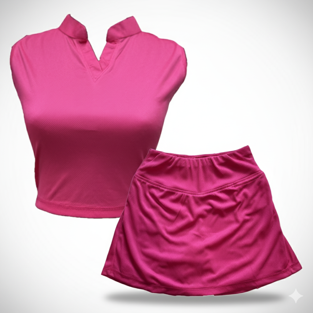 Sport Ladies Set – Crop Top Hot Pink Sleeveless With Collar V Neck – Skirt Hot Pink With Piled Up Waist Style & Left Side Pocket In Front.